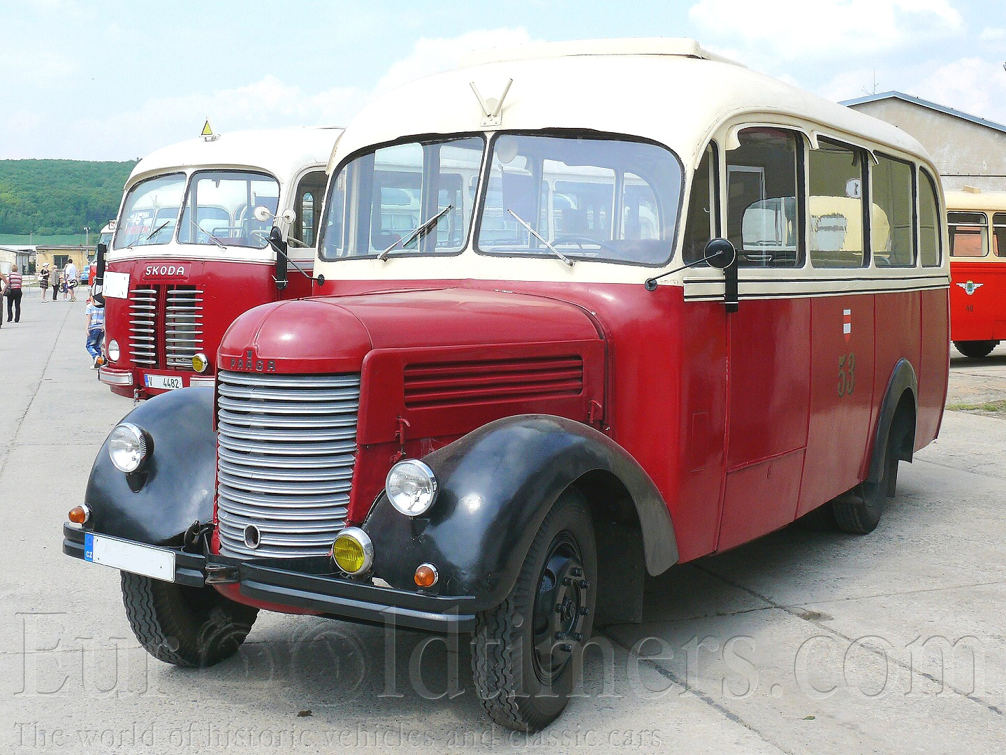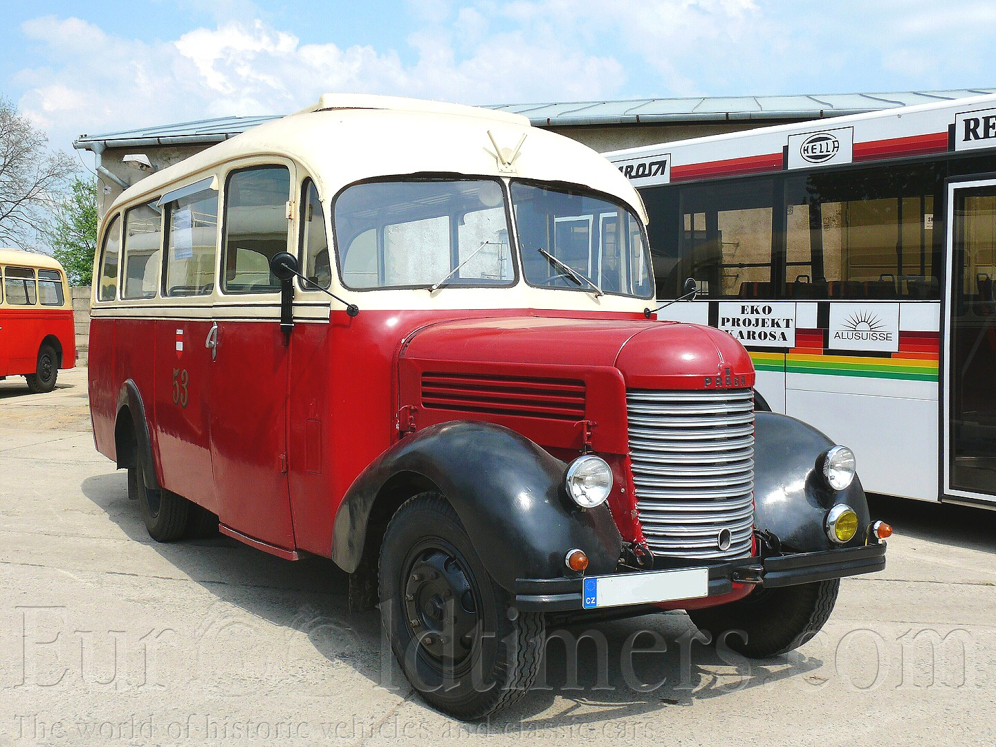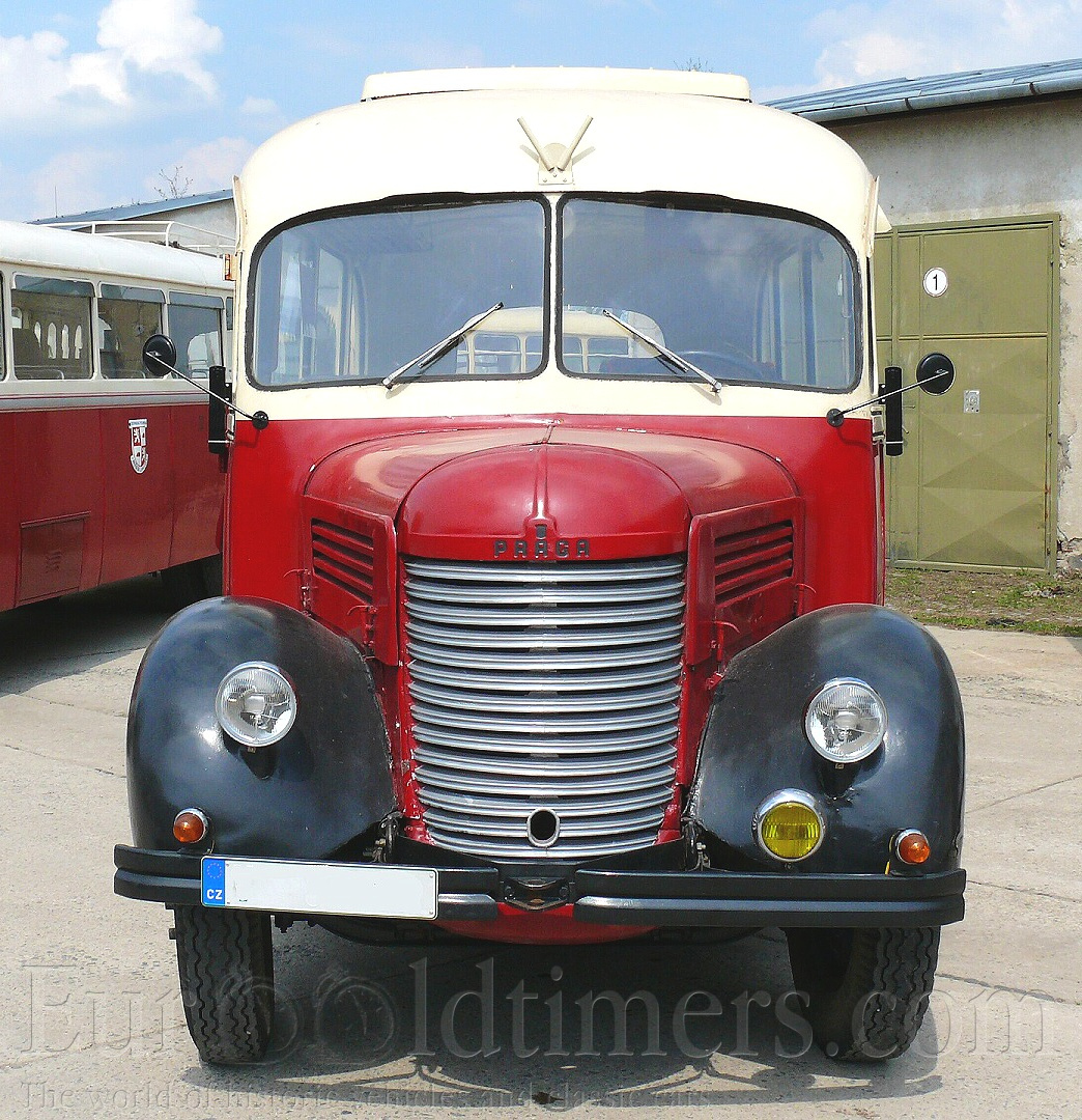 Historie a popis: Vozy Praga RN a RND prošly za dobu své výroby složitým vývojem a výrobními změnami. První Pragy RN 1. serie se objevily už v roce 1933. Šlo o „rychlý nákladní“ automobil ( proto RN ) o výkonu 52 koní / 2800 ot. min. Šestiválcový motor při vrtání 80 mm a zdvihu 115 mm měl objem 3468 ccm. Byl osazen karburátorem Zenith 36 TP. Ventilový rozvod byl SV, blok válců odlit z litiny, kliková skříň z elektronu. Hlava motoru byla hliníková. Zapalování se používalo zn. Bosch a elektroinstalace měla rozvod 12 V. Výkon motoru byl přenášen přes suchou jednokotoučovou spojku na čtyřstupňovou převodovku, odtud kardanem k zadní nápravě opatřené dvoumontáží kol. Náprava byla v provedení „banjo“ a používala ozubení Gleason. Brzda byla u první série mechanická, později byla přepracovaná na kapalinovou. Rám byl lisovaný z ocelového plechu a výztuhu tvořilo šest příček. Přední i zadní náprava byla tuhá, odpružená podélně uloženými půleliptickými pery. Budka řidiče byla vyrobena smíšenou konstrukcí, na dřevěné kostře byly natlučené hřebíčky plechové pláty. Byla dvoudveřová se zatahovacími okny, původně značně hranatá. Její tvary se postupně zakulacovaly a v roce 1939 dostává Praga RN podobu, kterou si někteří pamatujeme. Oblou přední masku vodorovně žebrovanou, design konce 30. let. První série se začala vyrábět v roce 1934, 2. série v roce 1936, mění se karburátor, původní Zenith 36 TP je nahrazen typem 42 TB. Následující série mění tvar kabiny, motor se zdokonaluje a dostává výkon 68 koní, v roce 1937 ve třetí sérii již 72 koní. Od 5. série v roce 1938 se používá karburátor Solex 40 FAIP, od roku 1948 Solex 35 AIP ( 40 AIP ), který při zachování výkonu snižuje spotřebu paliva. Za války se vyráběly především valníky, které byly dodávány německé a slovenské armádě. Nesmíme přitom zapomenout na téměř 10 000 vozů Praga RN vyrobených v licenci v Jugoslávii. Po válce vyrábí Praga osvědčený typ i nadále. Zprvu dokonce na pohon dřevoplynem, kdy takto byly upraveny i vozy, které přežily válku. Od roku 1946 se opět plně rozbíhá výroba lehce modernizované RN podoby roku 1939. Rám byl zesílen a obdržel sedm výztužných příček, stejně tak byla zesílena listová pera. Vůz byl dodáván v provedení valník, vojenský valník (poznáme jej podle kruhového otvoru s víkem nad sedadlem spolujezdce), speciální skříňový automobil s různou možností využití (ambulance, pojízdná dílna, komunální vůz). Dále byly vyráběny sklápěče, cisterny, mnozí si pamatujeme nádherné kulaté autobusy. Karoserie s charakteristicky zaobleným zadním čelem již byla celokovová, vně oplechovaná. Vpředu po pravé straně byly jednokřídlové dveře, polstrovaná sedadla měla u linkové verze příčné uspořádání 2+2, u městských autobusů převažovaly podélné lavice. Autobusy Praga RND byly vyráběny již v době druhé světové války, největší dodávky spadají až do doby po jejím skončení. V městské dopravě se uplatnily v omezené míře, nicméně provozovány byly u většiny tehdejších dopravních podniků přibližně do poloviny šedesátých let. Dochovaný vůz na snímcích je z roku 1949 a byl vyroben pro Krajské oblastní divadlo Pardubice, později jej zakoupil tamnější n.p. Kniha. V období 1969 až 1970 sloužil ještě Svazarmu Transporty Chrudim. Posledním majitelem byl pan Ondráček, od něhož TMB autobus zakoupilo v roce 1988. Vozy RN byly vyráběny až do roku 1953, kdy továrnu opustila poslední 48. série. U nás bylo vyrobeno přes 23 tisíc vozů RN a dalších, již zmíněných téměř 10 000 v Jugoslávii. V roce 1934 představuje automobilka Praga výše popisovaný typ RN s dieslovým motorem. Vůz dostává označení Praga RND 1. serie. Šlo o řadový čtyřválec s rozvodem OHV. Kompresní poměr byl 18:1, vstřikovací soustava byla zn. Bosch. Výkon byl kolem 50 koní při 2000 ot/min., postupně byl zvyšován na 60 koní. Vše ostatní bylo totožné s typem RN včetně radikální změny karoserie v roce 1939. Poválečné RND dostaly další výztuhu rámu a to pod motor, dále měly těžší převod v rozvodovce, protože naftový motor měl menší počet otáček. Motor měl původně předkomůrky Ricardo Whirpool, které byly po válce nahrazeny typem Comet. Hlavy motoru byly dvě, každá pro dva válce, což umožňovalo snadnější opravy. Spotřeba paliva byla udávána 16-17l / 100km, což bylo na nákladní vůz třítunové kategorie skutečně málo. Na šasi RND byla v roce 1947 v převážné 15. sérii postavena řada autobusů. Motory RND měly obsah 4500 ccm při vrtání 105 mm a zdvihu 130 mm dávaly v poválečném provedení 60 koní ( 2000 ot. min. ). Poslední poválečné RND byly vyrobeny v roce 1955. Celkově opustilo továrnu necelých 16 tisíc kusů. U našich dobrovolných hasičských sborů se zachovaly, relativně často, automobilové stříkačky AS 16. Byly vyráběny počátkem 50. let na podvozku Praga RN. Karoserie byla smíšené konstrukce, dřevo pobité plechem. V prostoru řidiče byla kabina pro desetičlennou posádku. Navazovaly oddělené ukládací prostory pro hasičskou techniku přístupné z boků a zadní části vozidla. Vpředu, před motorem se nacházelo čerpadlo, které mohlo přepravit až 1600 litrů vody za minutu. ( proto označení AS -16 ). Původní stroje byly dodávány v zelené khaki barvě (interiéry většinou zůstaly). V 60. letech byly přestříkávány do známé červené barvy. Také původní červené majáky a světlomety byly nahrazeny modrými. Některé hasičské RN jsou do detailu renovovány.
