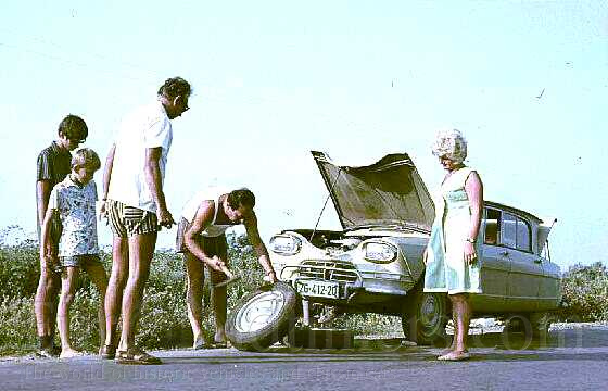 AMI 6 vyráběla francouzská avantgardní automobilka Citroën v letech 1961 až 1969. Vůz byl postaven na podvozku typu 2CV, měl plochý vzduchem chlazený dvouválcový motor s protiběžnými písty, tak zvaný boxer. Motor poháněl přední kola. Podobně jako typ 2CV měl také AMI 6 měkké pérování vinutými pružinami se vzájemně propojenými předními a zadními koly na každé straně vozu. Tento systém zabraňoval podélnému rozhoupání a při tužším pérování by zabraňoval také naklánění vozu v zatáčkách. AMI 6 byl v šedesátých letech dvacátého století vyráběn také v tehdejší Jugoslávii v licenci firmou TAS. Od pamětníka: Při návštěvě Jugoslávie v roce 1969 jsem se tímto vozem krátce svezl (jako pasažér) jak po jadranské magistrále, tak po prašných horských silnicích. Vůz se vyznačoval perfektními jízdními vlastnostmi, hlavně na špatných horských jugoslávských cestách. Tyto cesty byly prašné, bez asfaltu, asi ve stavu našich polních cest. Pérování vozu pohlcovalo bez problému všechny nerovnosti, vůz se pouze více nakláněl při průjezdu zatáčkami. Motor s výkonem 22 koní poskytoval vozu na tehdejší dobu dostatečnou dynamiku, Citroën AMI 6 s přehledem stačil otcově Octavii Super, ta měla sice dvakrát větší motor, ale asi o 300 kg vyšší hmotnost. Model AMI 6 se vyznačoval negativním sklonem zadního okna. Podobné, obráceně skloněné, zadní okno měl také tehdejší Ford Anglia. Některým zákazníkům se tento stylistický prvek nemusel líbit, ale většina poválečných modelů Citroën (2CV, DS, AMI6) se vyznačovala osobitým designem, který je odlišoval od ostatních vozů. Vozy Citroën měly osobitý také interiér, například volant neměl klasickou příčku, ale pouze jedno rameno od hřídele k věnci. Na prvních dvou snímcích je v Jugoslávii vyrobený vůz AMI 6, ve kterém mě svezli.