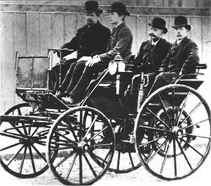 Na snímku jsou Daimler a Maybach ve svém prvním automobilu. Motorový kočár Daimler z roku 1886 byl prvním čtyřkolovým vozidlem poháněným benzínvým motorem. Daimler stavěl na svou dobu vysokootáčkové motory s vyšším měrným výkonem. První Daimlerův vůz je zachován v podnikovém muzeu Daimler-Benz ve Stuttgartu.